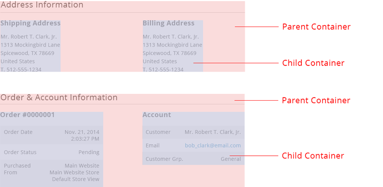 The following example, shows two sets of parent & child containers. Each parent containers has 2 children containers. There can be 1 or more children. It is not recommended to have more than one layer of parent-child (i.e. grand children are not recommended) But if there are exceptions made, the hierarchy should be shown clearly.
