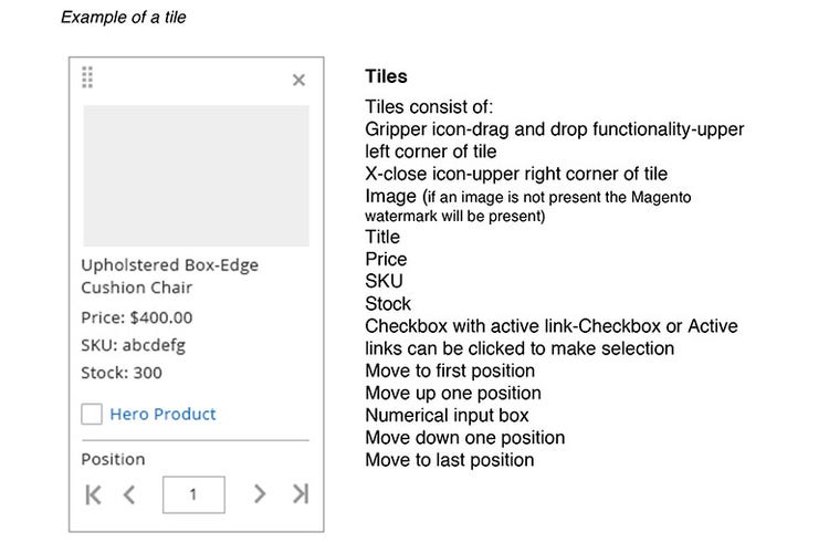 Once a tile becomes a "Hero" a 1px yellow stroke highlights the tile at the top of the category. The user can have infinite hero products in a category. When there is more than one product highlighted in the hero space at the top of the category, the user can drag and drop tiles within the highlighted hero space. (Ex: A user can drag and drop the first hero tile to the last hero position as long as it is on the same page) The advance position icons and numeric input field are not active while a tile is in the hero position. To activate the advance position and numeric input field, the user must remove the tile from the hero space.