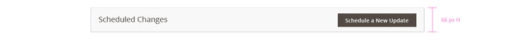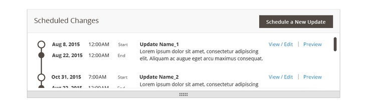 For all stage-able entities, a Scheduled Changes Module appears on the top of each entity's page. An entity's module provides a quick summary of scheduled updates, as well as controls to view, edit and preview individual updates.