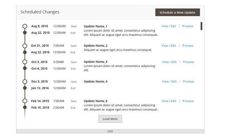 The "Load More" button appears at the bottom of the list of scheduled updates. By default, 5 scheduled updates are displayed. To view more, users can click "Load More" to add the next set of scheduled updates.