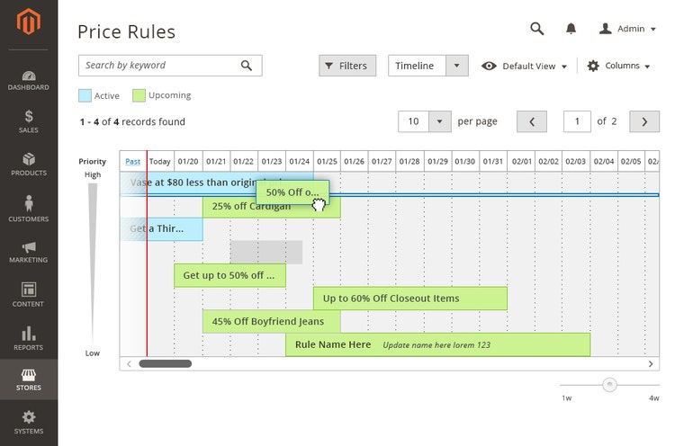 This is a variation of the timeline. This view only appears when stage-able entities on the timeline need to be ordered by priority. In the example displayed below – the priority scale has been used to display the sort order of the rules. To re-arrange the order, an item on the timeline can be dragged and moved.