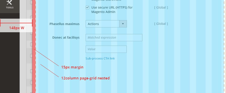 - A 12-column fluid-width content grid is placed next to the page's 1-column fixed-width left navigation