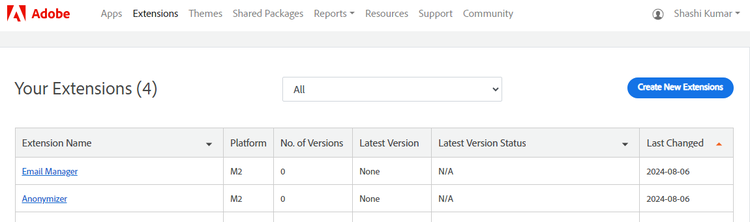 All extensions submitted to Commerce Marketplace are managed from the Extensions page in the Marketplace Developer Portal. It shows the status of each extension and language pack you have submitted, and provides access to the profile and version history of each. You can also use the workspace controls to sort and filter the list.