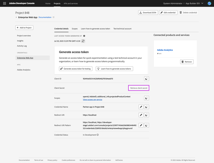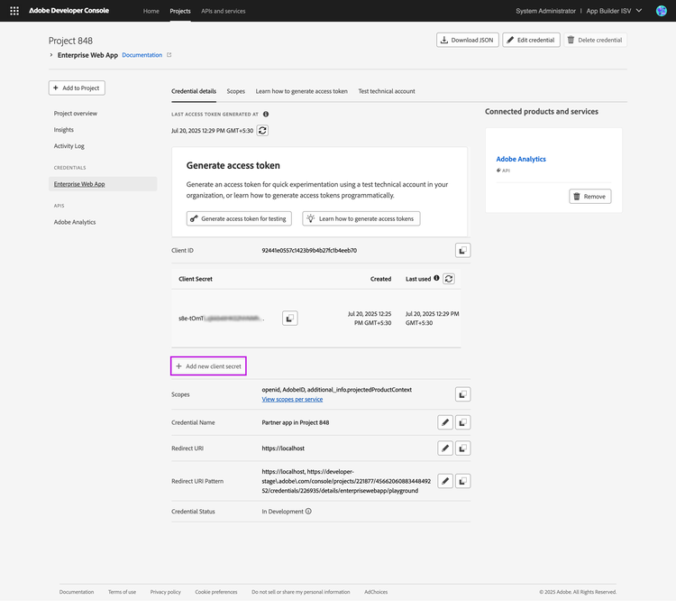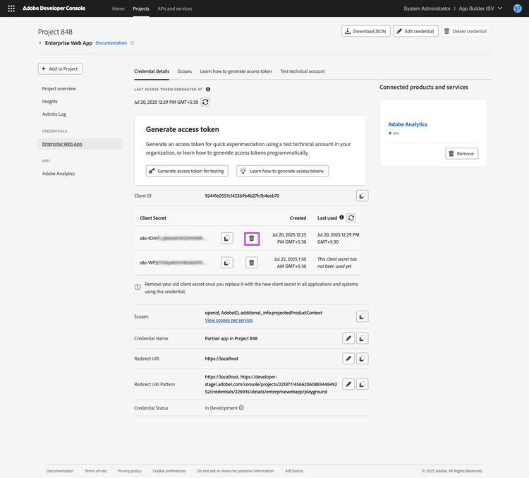 Rotating client secrets periodically is recommended because your application will deal with Adobe customer data. Furthermore, you must rotate your client secret immediately if you believe it has been compromised.