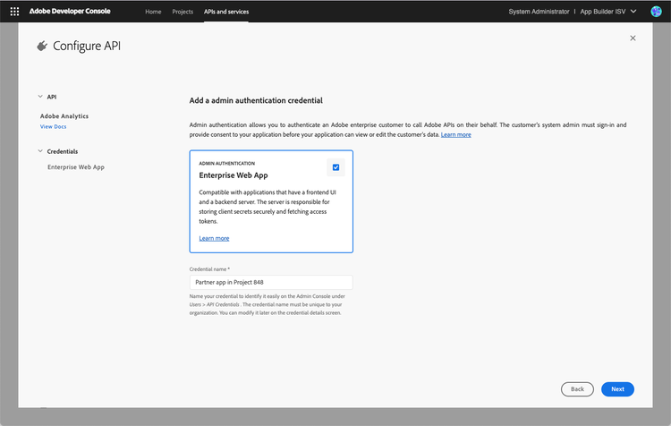 - Once you select Admin authentication, the Enterprise Web App credential will be automatically selected on the next screen. Here you can supply the name of your app as it will appear on the Consent screen during testing. You can change your app name later and also at the time of app submission.