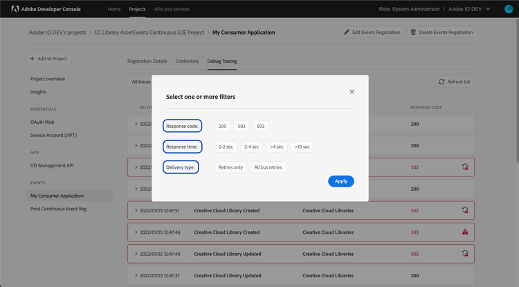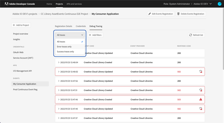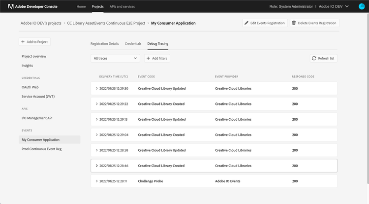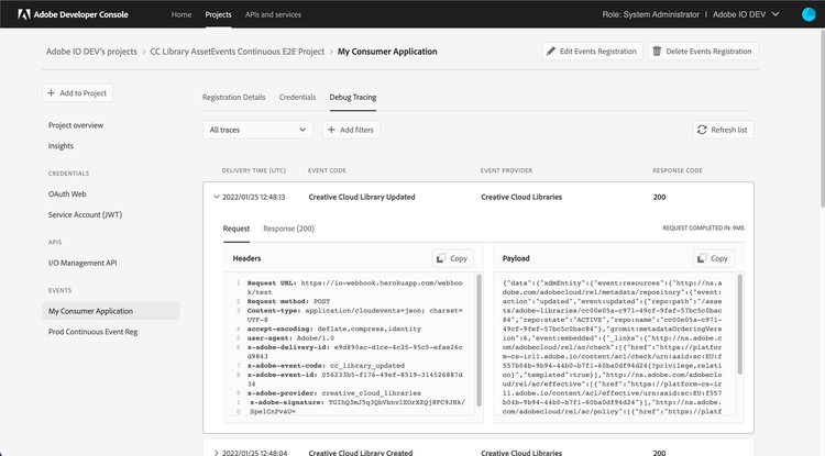 To troubleshoot issues with event-registrations, Adobe offers Debug Tracing feature. Using Debug Tracing, you can inspect the activity between the Adobe service and your integration to see what data is being sent and how your integration is responding. Each trace comprises of the event delivery HTTP request (sent by I/O Events), and response by the consumer application. This information can be of critical importance to your debugging efforts.