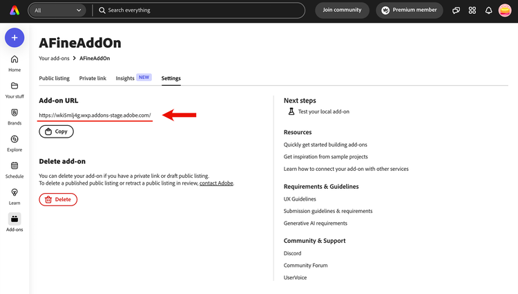 Your add-on container will be created and a settings panel like the one shown below will be presented. Please note the unique subdomain URL from where your add-on will be hosted, and a button to delete the listing if needed.