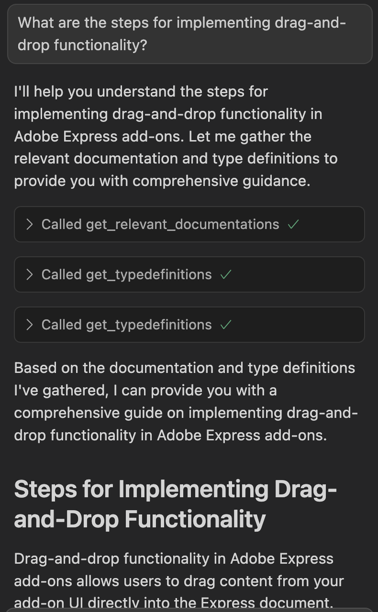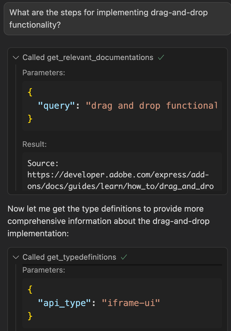 - Structured Access: Your LLM gets grounded information from the latest Adobe Express Add-on documentation