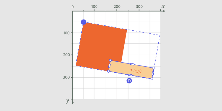 The one Rectangle on the canvas, as we've used here for demonstration purposes, is but a simplified example; when dealing with real-world scenarios, the element's parent container may have a different rotation or translation, which affects the element's position and global angle. The Document Sandbox API provides some handy features that help you account for the parent's transformations.