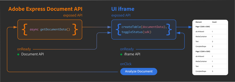 - Communication API: the iframe and the Document Sandbox can expose and import each other's API via proxy objects. The Communication API wraps all inter-context function invocations with a Promise; hence, the need to