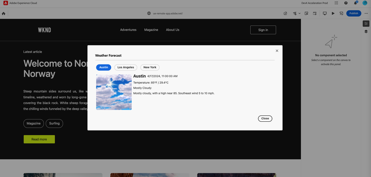 The Universal Editor (host instance) provides an API for showing modal dialogs with custom UI defined by an extension. These modals can be triggered by a click on the button or other events. Modal API is defined in the modal namespace.